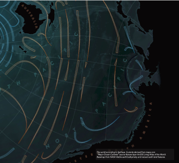 The world according to Spilhaus. Currents derived from maps.com “Major Ocean Currents” source feature layer ArcGIS Living Atlas of the World. Basemap from NASA Visible earth bathymetry and natural earth land features.