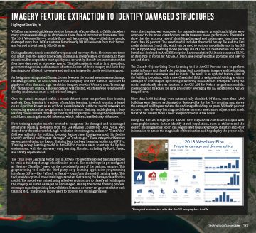 During a disaster, time is essential for response and recovery efforts. Slow response times can result from the lack of timely data and manual interpretation of this data. In these situations, first responders must quickly and accurately identify urban structures that fires have destroyed or otherwise spared. This information is vital to first responders, government agencies, and insurance adjusters. The use of drone imagery and Esri’s deep learning tools efficiently processes and analyzes imagery for timely decision support.