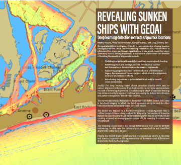Geospatial artificial intelligence (GeoAI) is the combination of using location intelligence and GIS with the deep learning capabilities of AI. While GeoAI is often used for object and image classification, it can also be used for object detection, such as finding shipwrecks at the bottom of the ocean. The benefits of locating thousands of shipwrecks include: