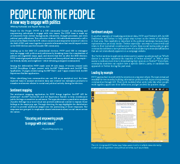 People for the People (P4TP) is a GIS community focused on educating and empowering individuals to engage with civic issues. The P4TP team is made up of volunteers from diverse backgrounds, ethnicities, thought processes, and even political party affiliations. This collective of about 150 individuals answered a call to action led by Black Girls M.A.P.P., which connects and empowers women of color in the field of GIS, and came together to provide information that would impact voters in the 2020 election and the broader GIS community.