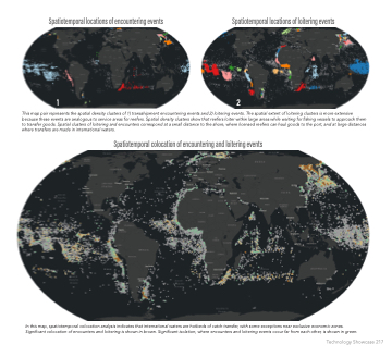 This map pair represents the spatial density clusters of 1) transshipment encountering events and 2) loitering events. The spatial extent of loitering clusters is more extensive because these events are analogous to service areas for reefers. Spatial density clusters show that reefers loiter within large areas while waiting for fishing vessels to approach them to transfer goods. Spatial clusters of loitering and encounters correspond at a small distance to the shore, where licensed reefers can haul goods to the port, and at large distances where transfers are made in international waters.